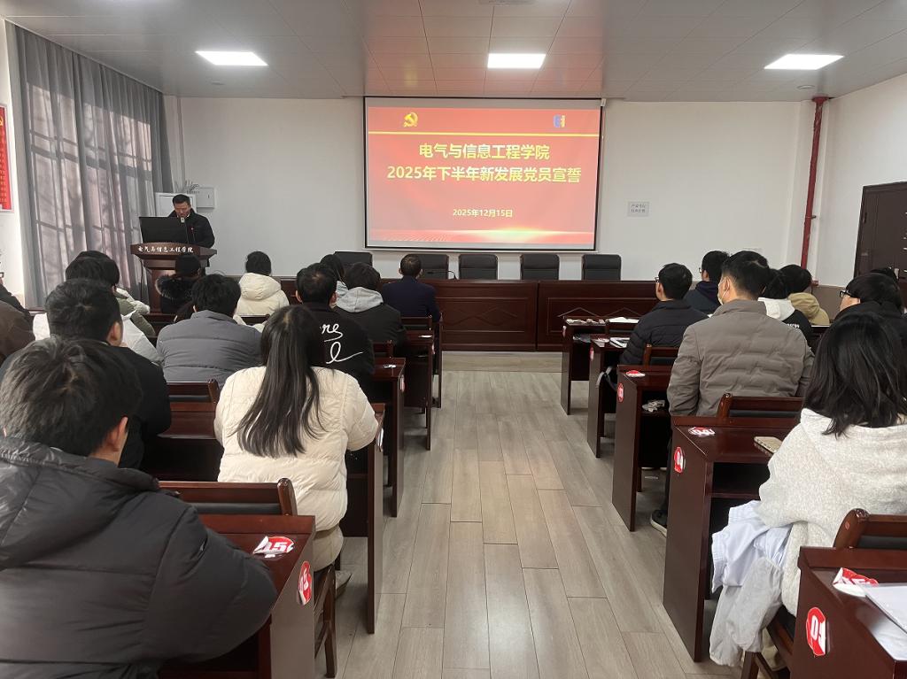 为进一步教育引导新发展党员铭记入党初心、强化党员意识、坚定理想信念,发挥党员先锋模范作用。12月15日下午,六合彩网上投注app 党委在电气楼113室举行2025年下半年新党员入党宣誓活动暨专题党课。六合彩网上投注app 党委书记丁忠利、党委副书记孔洋波、2025年下半年新发展党员参加活动,孔洋波主持。