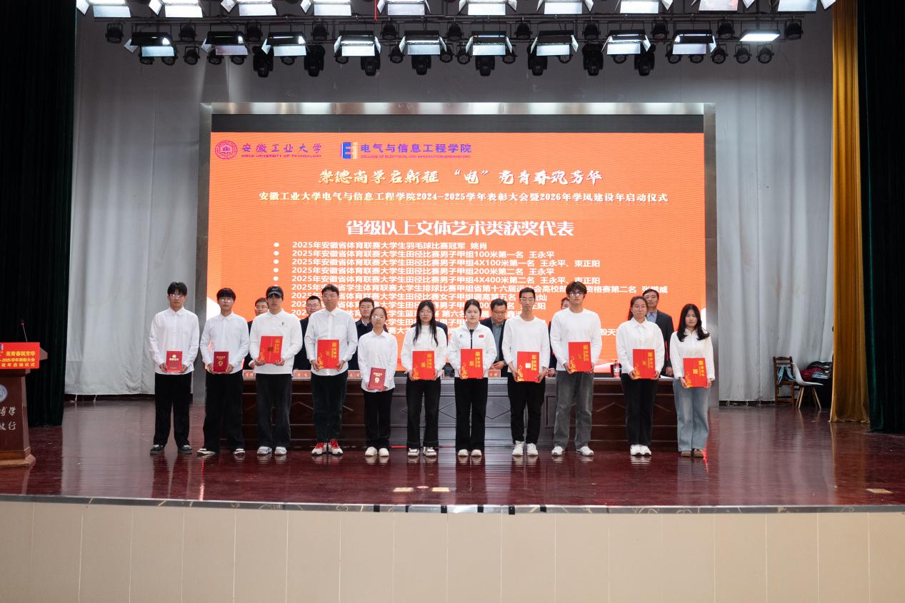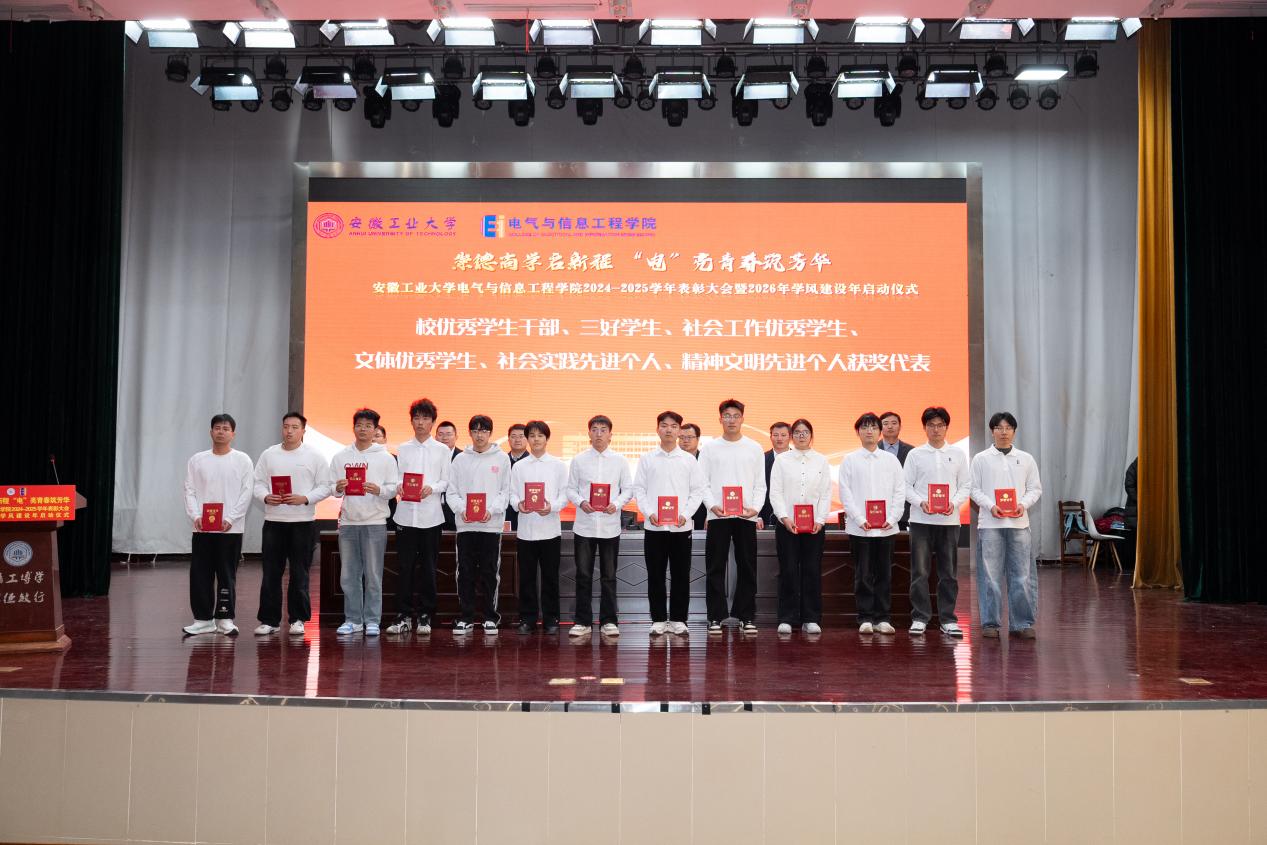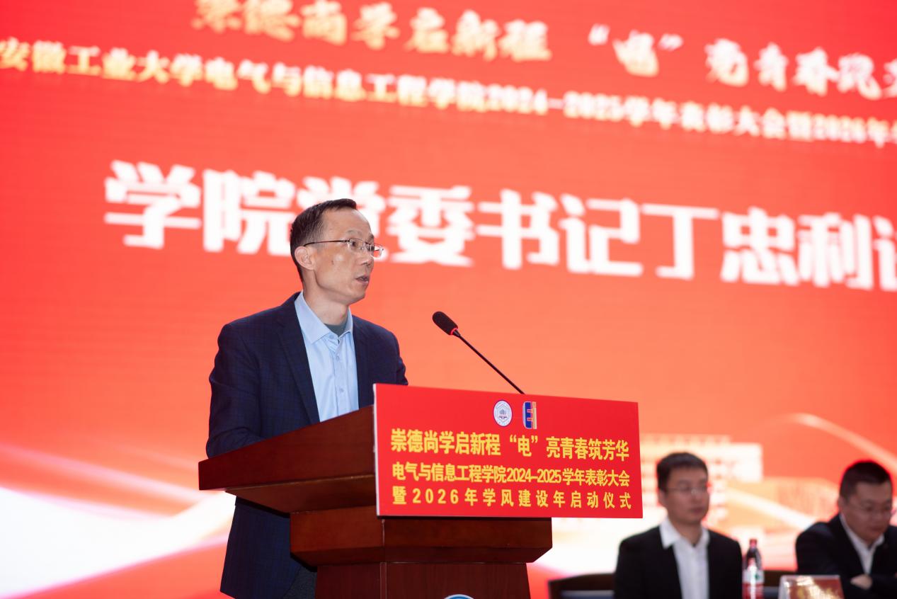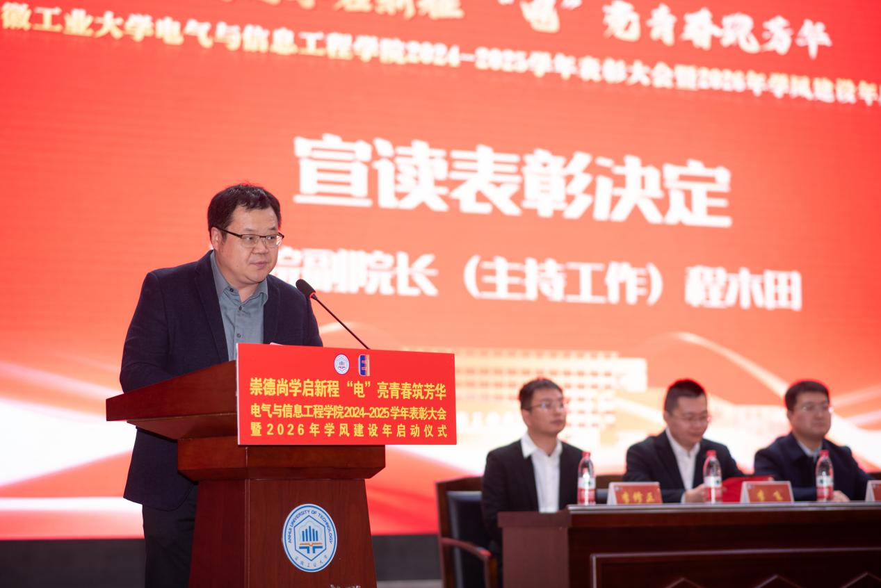 为表彰先进,凝聚奋进力量,深化学风建设,12月31日下午,六合彩网上投注app 以“崇德尚学启新程,‘电’亮青春筑芳华”为主题,在秀山校区新大学生活动中心报告厅隆重举办2024-2025学年表彰大会暨2026年学风建设年启动仪式。学生工作部副部长王萌、六合彩网上投注app 党委书记丁忠利、副院长(主持工作)程木田、党委副书记、纪委书记、副院长孔洋波、副院长李飞、副院长张前进等领导出席会议,六合彩网上投注app 全体辅导员及学生代表共计400余人齐聚现场,共同见证荣耀时刻,共绘学风建设新蓝图。