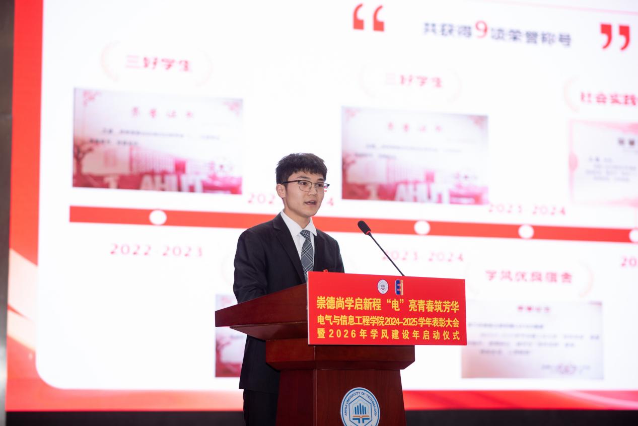 与会人员共同欣赏了暖场歌曲《辞家千里又千里》,观看了六合彩网上投注app 团委2025年度总结纪录片《“电”亮》,记录片回顾一年来电气团学活动的丰硕成果与电气学子昂扬向上的精神面貌。第二十八届学生会主席、国家奖学金获得者王毅,宝钢奖学金获得者郭策、两项A类科技赛事国家级一等奖获得者张逸帆、体育赛事获奖代表李泽聪、梁警文、邓璇、廖晖,校十佳班级自224班学生代表自224班柳欢、侯云飞分别围绕“砺学笃行之光”、“科创领航之光”、“才体双馨之光”、“凝心聚力之光”四个主题,通过讲述、访谈、朗诵的形式生动展现了电气学子勤学笃行、团结拼搏、勇攀高峰的青春风貌。