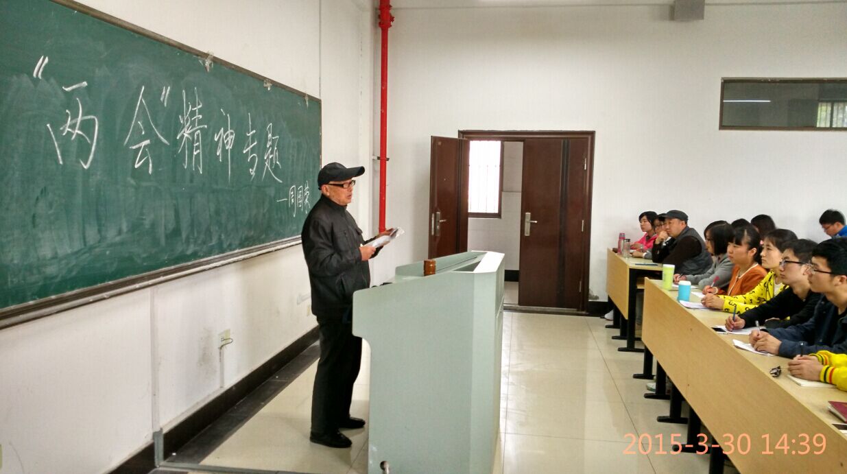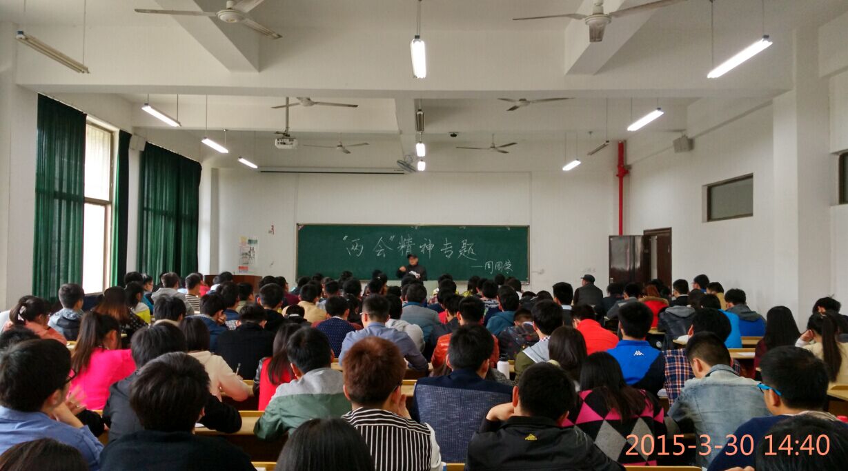 周国荣教授首先介绍了两会召开的基本情况,从2014年政府工作回顾、2015年政府工作总体部署及2015年政府重点工作三个方面,详细解读了李克强总理所作的2015政府工作报告。讲座深入浅出,内容丰富又有理论深度,学生反响热烈。
