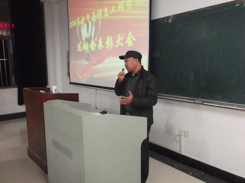 2014年田径运动会表彰大会在电气楼113召开。院党委副书记、副院长郭宏、院团委书记张满堂、院全体辅导员、校团委学生会代表、优秀运动员代表及部分大一同学出席大会。大会由张满堂主持。