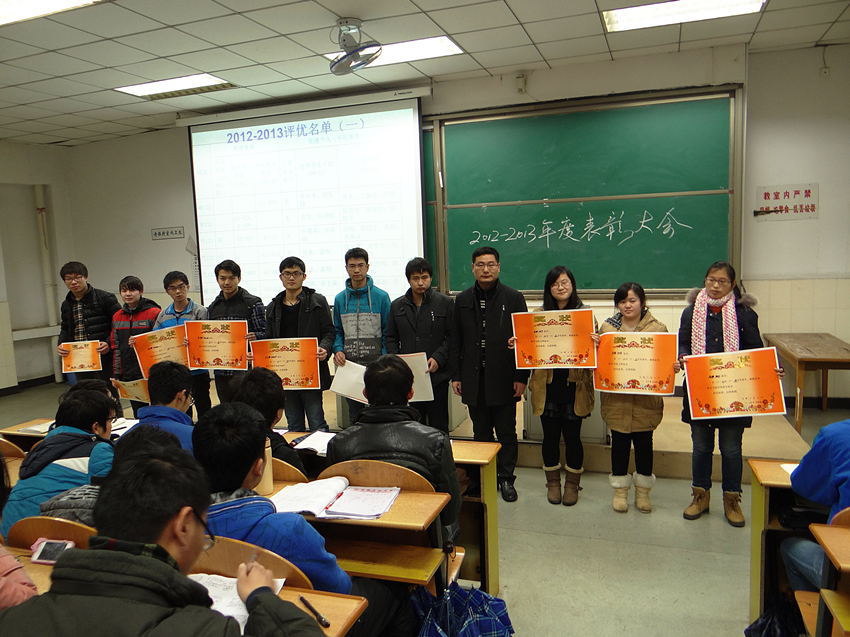 2012级电子、电气、通信三个专业在阶教104召开2012-2013表彰大会暨期末考试考风考纪宣传和假期教育会议。尚全主持了会议,七个班的260名同学参会。