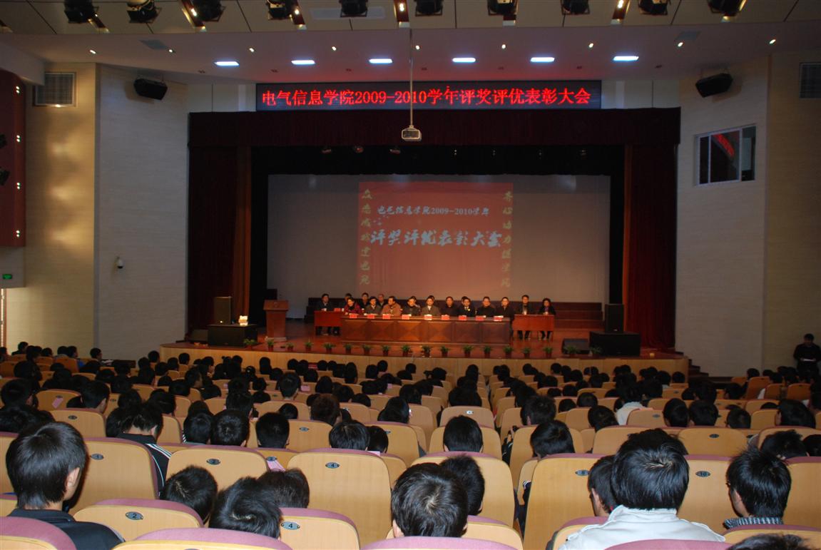2009-2010学年度学生评奖评优表彰大会在东区新大学生活动中心隆重召开。校党委副书记汪光阳,校关工委主任李明,学工部部长陈选华,校团委书记方华,电气信息六合彩网上投注app