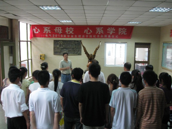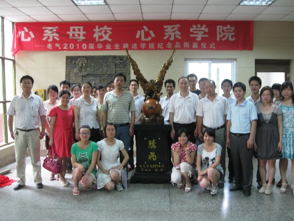 院党委书记孙世民、院长赵光兴、院党委副书记、副院长姚敏、院办公室主任郭宏以及2010届部分毕业生参加了仪式。仪式开始,赵光兴院长和毕业生代表李刚同学为雕塑揭幕,随后毕业生代表张腾达同学发言,表达了对院领导、老师四年来的培养、教育感激之情。最后院党委书记孙世民作了热情洋溢的讲话,孙书记要求毕业生到社会上要勤于学习、努力工作,心中要永远要记着母校,以后有时间常回母校看看,并对毕业生提出了殷切希望。