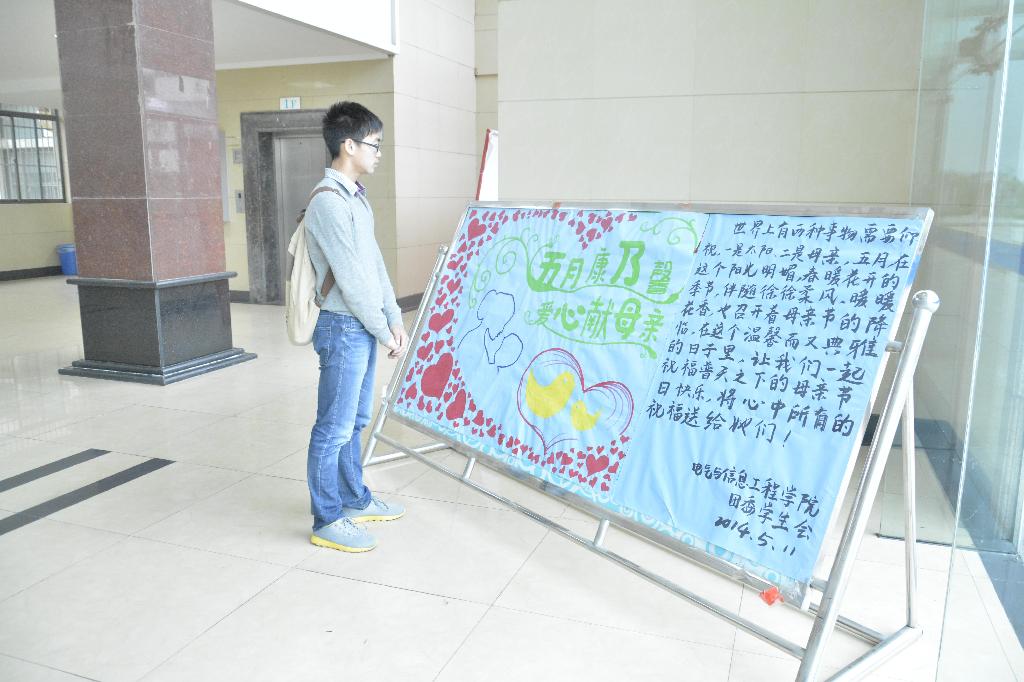 各年级的同学各显才能,通过给母亲的一封信,母亲节寄语,精美的祝福卡片以及“情浓五月天,感恩母亲节”集体签名等活动表达大家对母亲的深深祝福和思念,一系列活动也让工大的校园里弥漫了满满的温暖和感动。